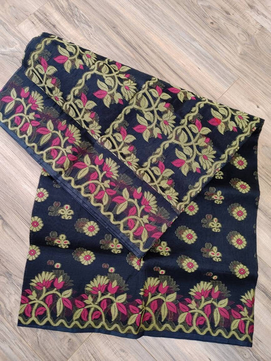 Tangail Tantuja Semi Muslin-Cotton Saree, Beautiful Black with Magenta-Golden Thread Work, Handwoven,Classy, Made in Tangail,Bangladesh