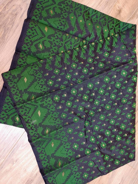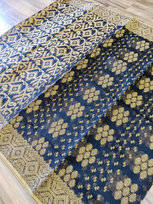 Tangail Semi-Moslin Saree, Black and Golden, Running Blouse Piece, Made in Tangail, Bangladesh