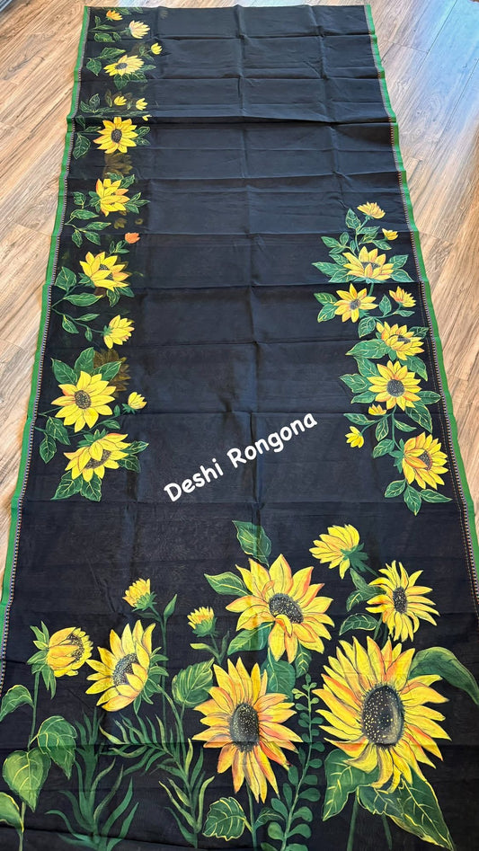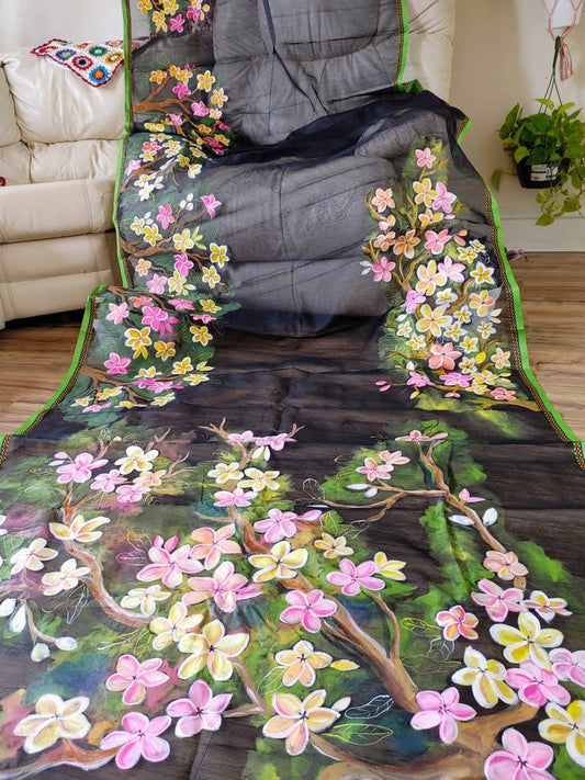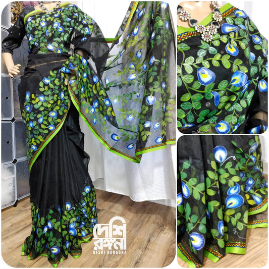 Handpainted Saree, Halfsilk Black Handloom Cotton Saree, Feel Special with this Exclusive and Rare Price of Art