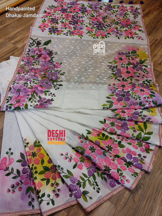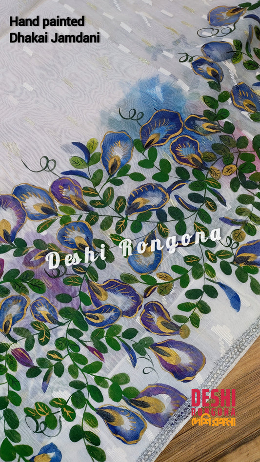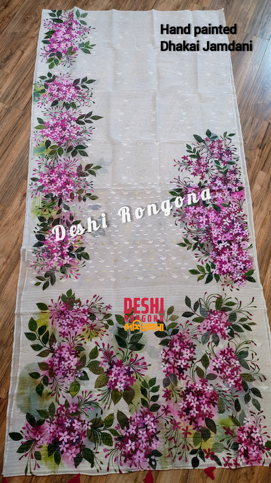 Handpainted Jamdani, Original Dhakai Saree | Madhobi (honeysuckle) Theme