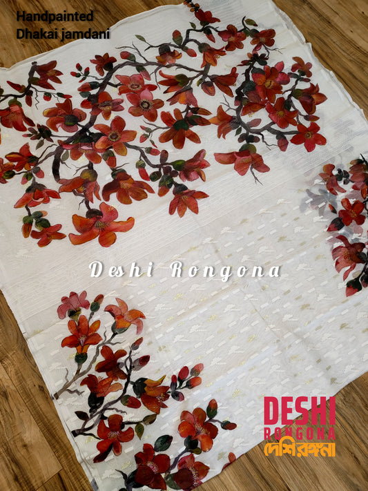 Original Dhakai Jamdani Handpainted, Halfsilk, Red/White Bombax Flower theme Classy Saree