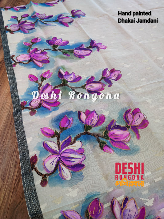 Handpainted Jamdani, Original Dhakai Saree | Pink Magnolia Theme