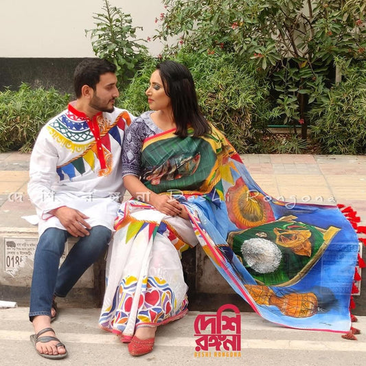 Exclusive Dhakai Jamdani Handpainted Couple Set, Handloomed Jamdani 80 count threaded ll Traditional, Elegant, Classy Saree and Punjabi
