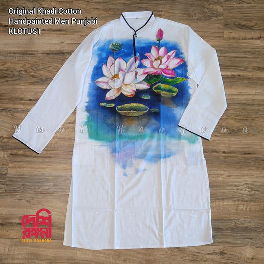 Original Khadi Handpainted Men Punjabi, Size 40 Loose fit, Lotus Pond theme, Handwoven, Comfortable, Elegant, Made in Dhaka, Bangladesh