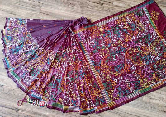Extraordinary Hand Stiched Kantha Saree, Maroon Bangalore Silk with Multi color Kantha Works, running blouse piece, Elegant,Classy Saree