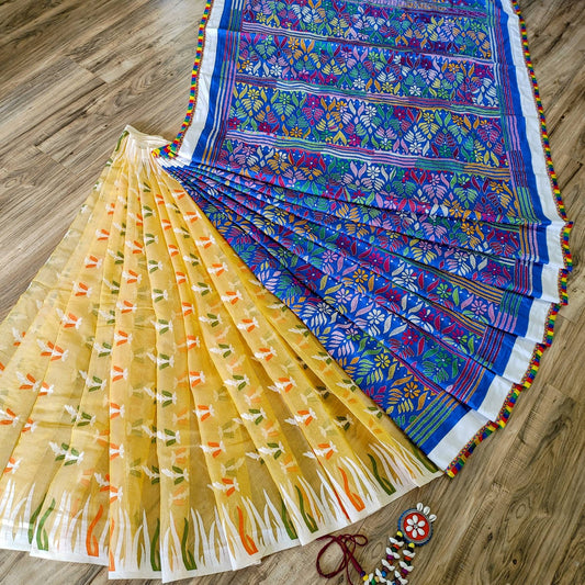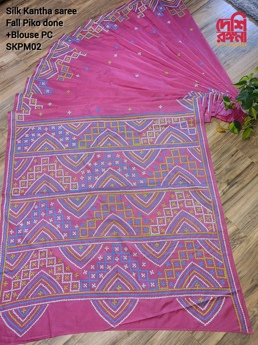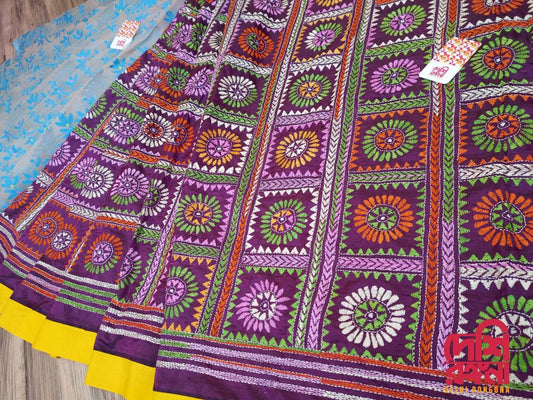 Extraordinary Hand Stiched Kantha Saree, Half Jamdani, Half Bangalore Silk with Multi color Kantha Works,running blouse piece, Elegant Saree