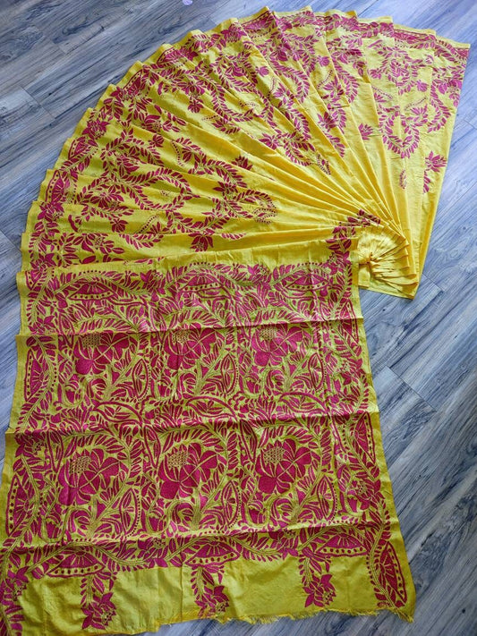 Extraordinary Hand Stiched Kantha Saree, Yellow Bangalore Silk with Red Kantha Works Allover, running blouse piece, Elegant,Classy Saree