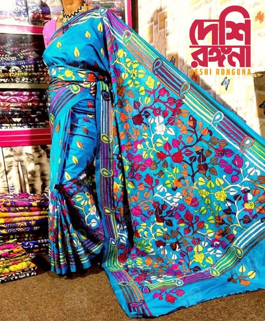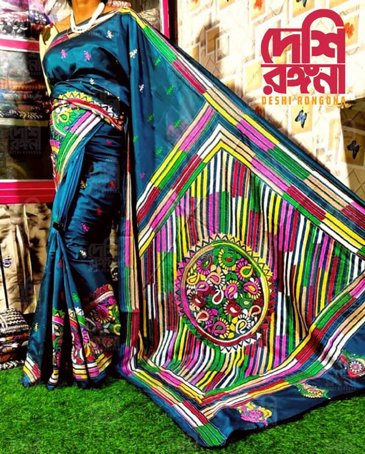 Extraordinary Hand Stiched Kantha Saree, Blue Bangalore Silk with Multi color Kantha Works, running blouse piece, Elegant,Classy Saree
