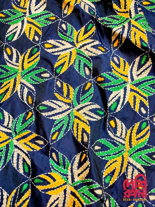 Exclusive Hand Stiched Kantha Saree, Navy Blue Bangalore Silk with Green/Yellow/Beige Contrast Kantha Stitch Works, Elegant, Classy Saree