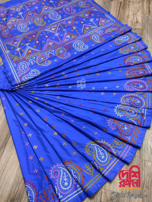 Extraordinary Hand Stiched Kantha Saree, Royal Blue Pure Bangalore Silk, Multi Gujrati Works allover, Fall/piko done, Elegant, Classy Saree