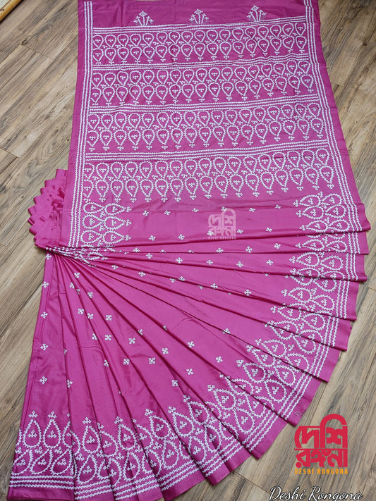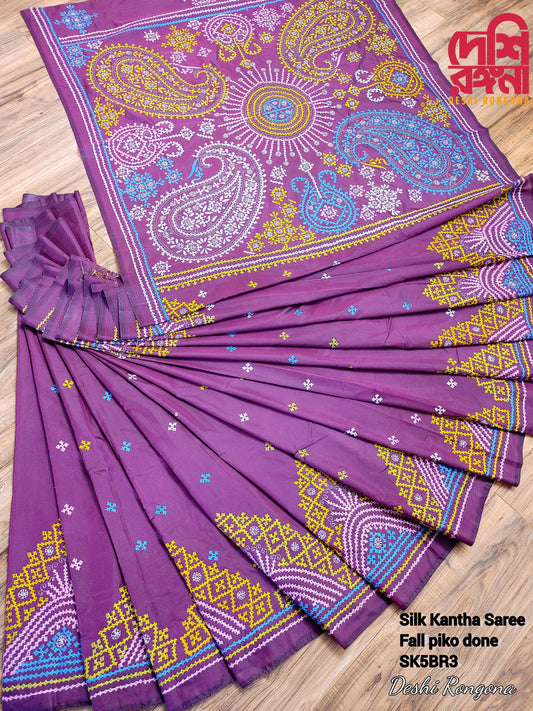 Batik Kantha Saree, Extraordinary Hand Stiched, light Purple Bangalore Silk with Multi thread Work, Fall piko done, Elegant and Classy Saree