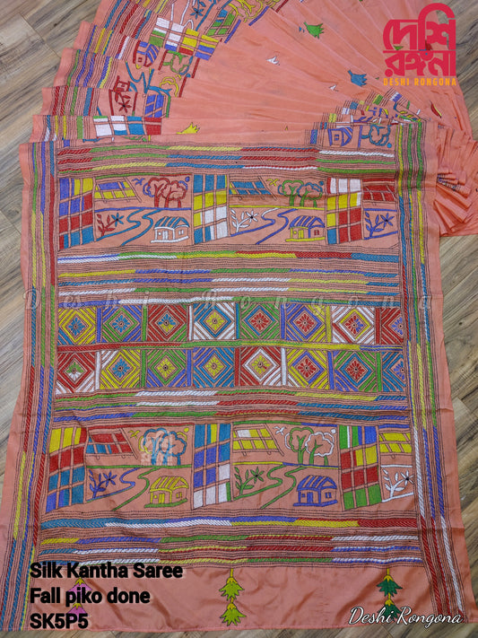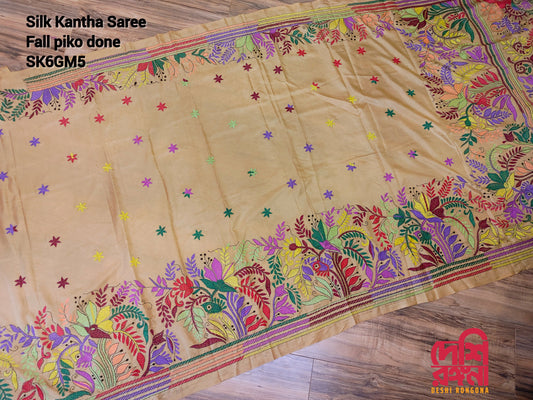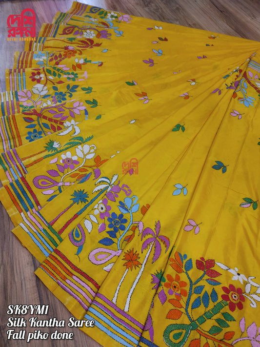 Extraordinary Hand Stiched Kantha Saree, Golden Bangalore Silk with Multi color Kantha Works, Fall piko done, Elegant, Classy Party Saree