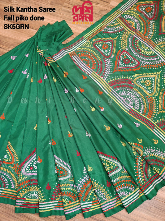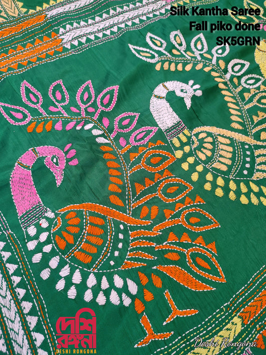 Extraordinary Hand Stiched Kantha Saree, Green Bangalore Silk with Multi color Kantha Works, Fall piko done, Blouse PC, Elegant,Classy Saree