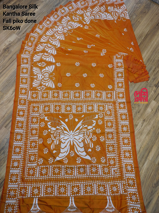 Extraordinary Hand Stitched Kantha Saree,Orange Bangalore Silk with Butterfly theme Kantha Works, Fall Piko Done, Elegant,Classy Party Saree