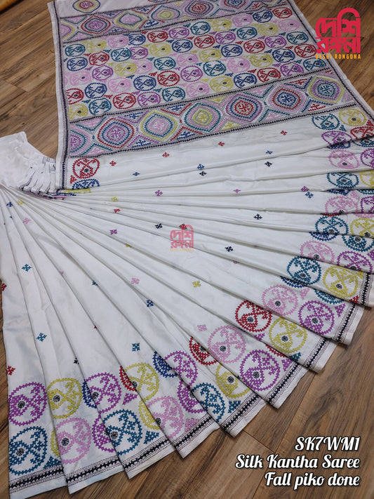 Extraordinary Hand Stiched Kantha Saree, White Pure Bangalore Silk, Multi Gujrati Kantha Works allover, Fall/piko done,Elegant, Classy Saree