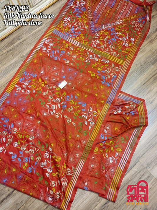 Extraordinary Hand Stiched Kantha Saree, Red Bangalore Silk with Multi Kantha Works Allover, Fall Piko Done, Indian Elegant, Classy Saree
