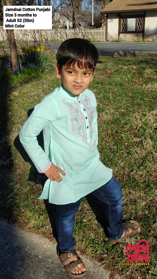 Original Dhakai Jamdani Kids Punjabi, Pure Cotton, Mint Green Color, Handwoven, Comfortable, Elegant, Made in Dhaka,Bangladesh