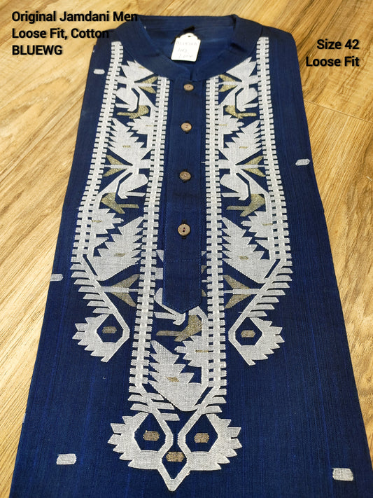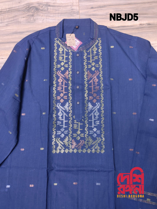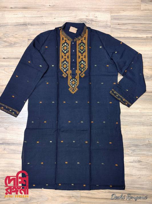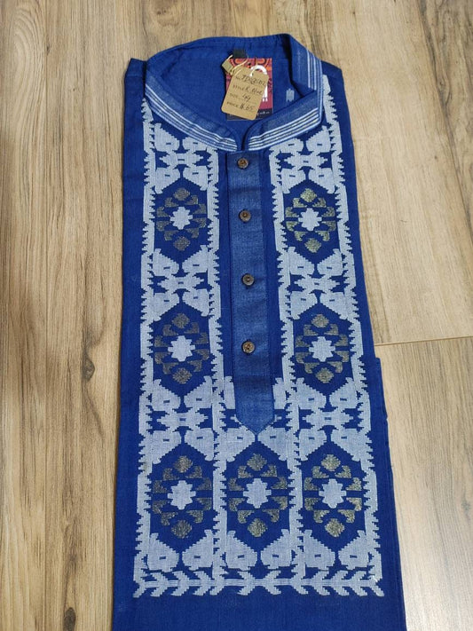 Original Dhakai Jamdani Men Punjabi, Pure Cotton, Handwoven, Navy Blue with Multi Jari Work, Comfortable, Elegant, Made in Dhaka, Bangladesh