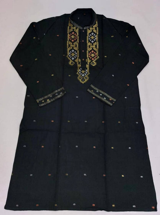 Original Dhakai Jamdani Men Punjabi, Pure Cotton, Handwoven, Black with Multi Jari Work, Comfortable, Elegant, Made in Dhaka, Bangladesh