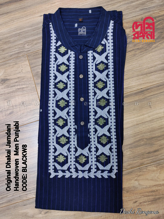 Original Dhakai Jamdani Men Punjabi, Handwoven Pure Cotton, Midnight Blue / White work, Stripped, Comfortable, Elegant, Made in Dhaka, Bangladesh, Loose