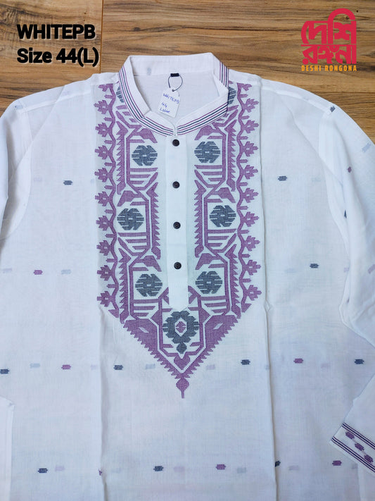 Original Dhakai Jamdani Men Punjabi, Handwoven Pure Cotton, White/Purple Comfortable, Elegant, Made in Dhaka, Bangladesh, Loose Fit Size 44