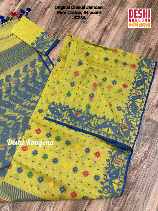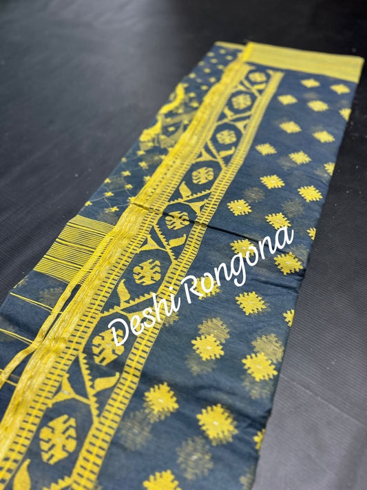 Gray Dhakai Jamdani Saree with Lemon Yellow work