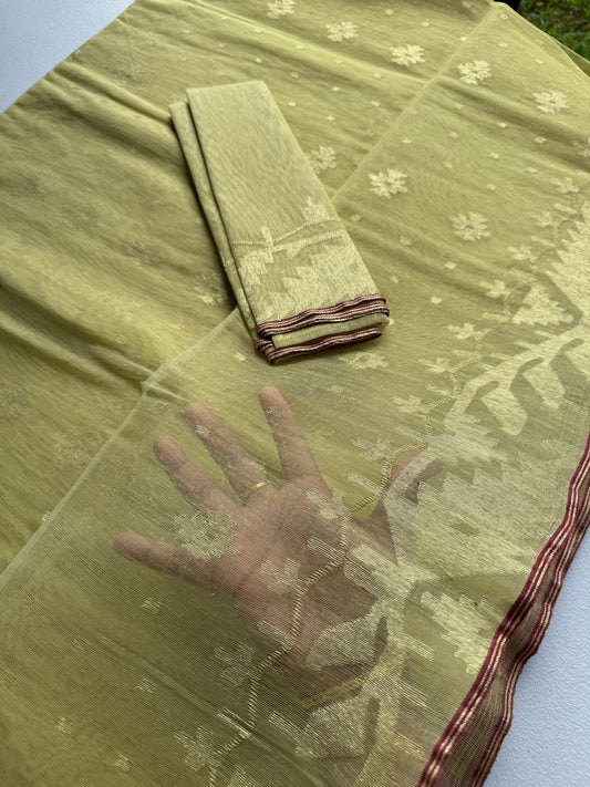 Elegant Dhakai Jamdani Saree, Classic Lemon Olive