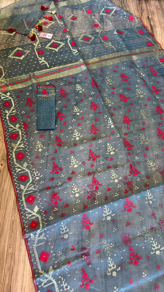 Gray Dhakai Jamdani Saree with Red and Zari work