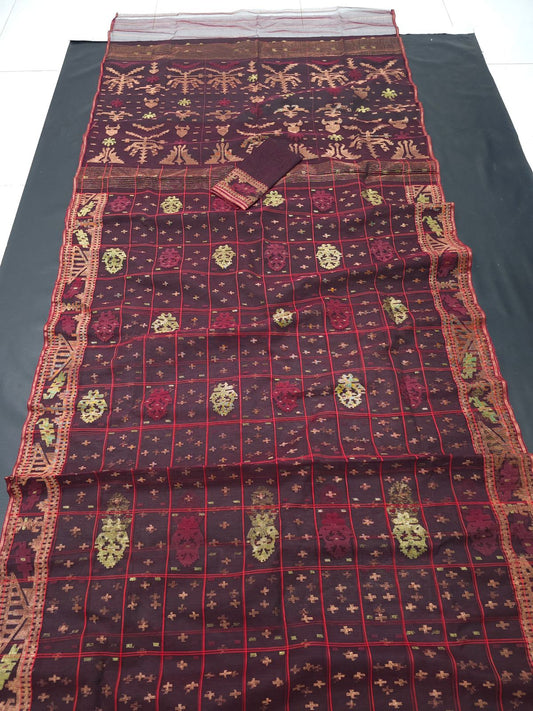 Elegant Deep Maroon Dhakai Jamdani Saree - Handloom Classic