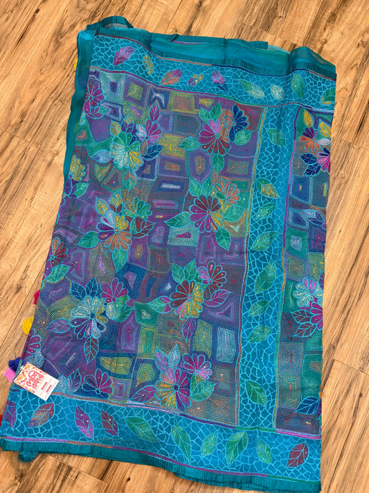 Original Moslin Handmade Karchupri work Saree, Beautiful Teal color, Bangladeshi Pure Sopura Muslin Saree, Super Soft and Light Weight