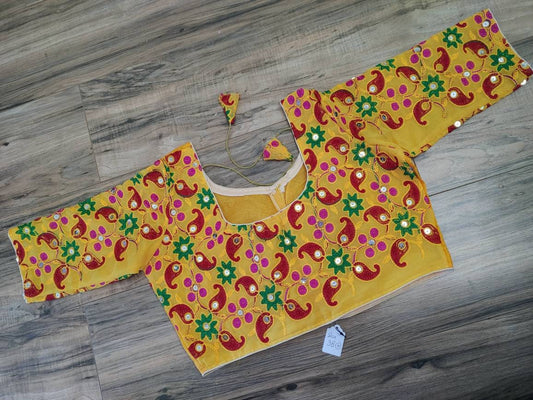 Elegant Readymade Yellow Pulkari Rajasthani Blouse that goes with any saree collection you have in your closet