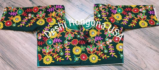 Elegant Readymade Green Pulkari Rajasthani Blouse that goes with any saree collection you have in your closet