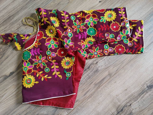 Maroon Blouse, Readymade Marron Pulkari Rajasthani Blouse that goes with any saree collection you have in your closet
