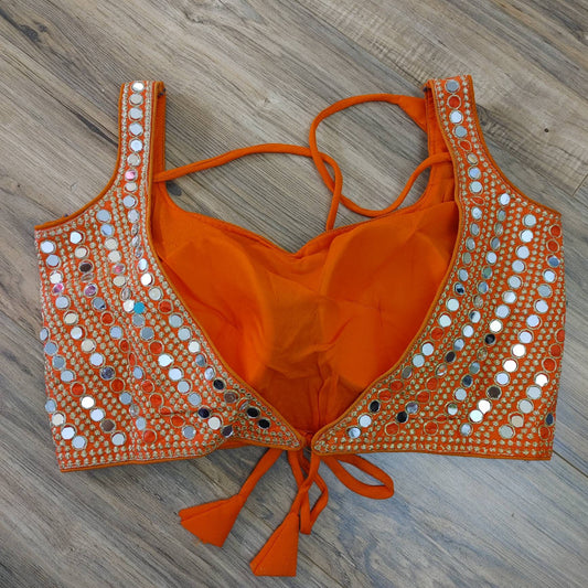 Orange Mirror Work Blouse, Golden wire Embroidery, Gujrati Real Mirror Work, Free Size 38/alter upto 42, Gorgeous Readymade Party Blouse