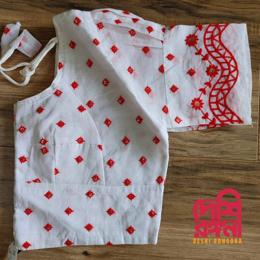 White-Red Cotton Blouse, Durga Puja Theme Readymade Blouse, Size 34-40, Comfortable, goes with any contrast saree collection of your closet