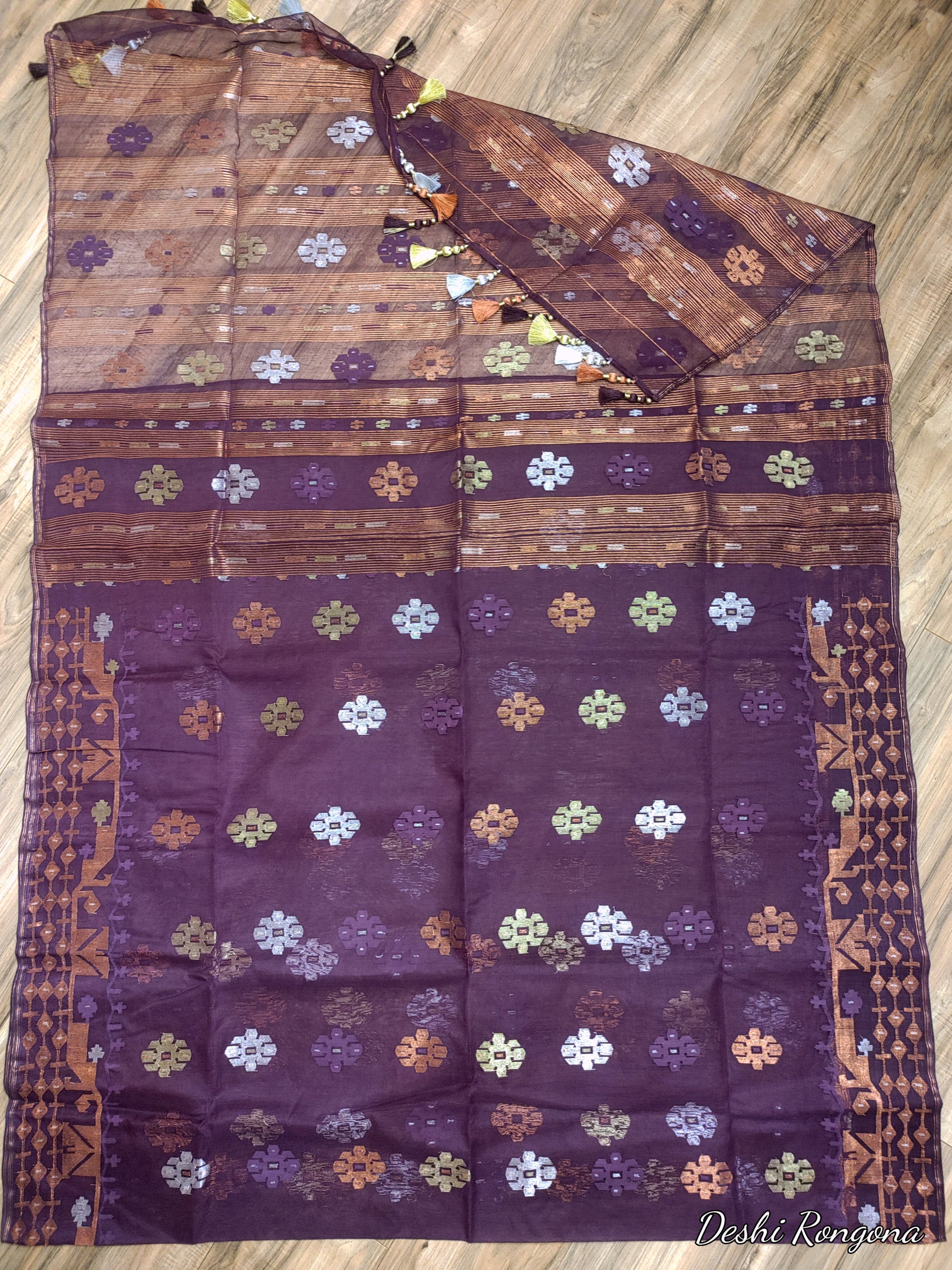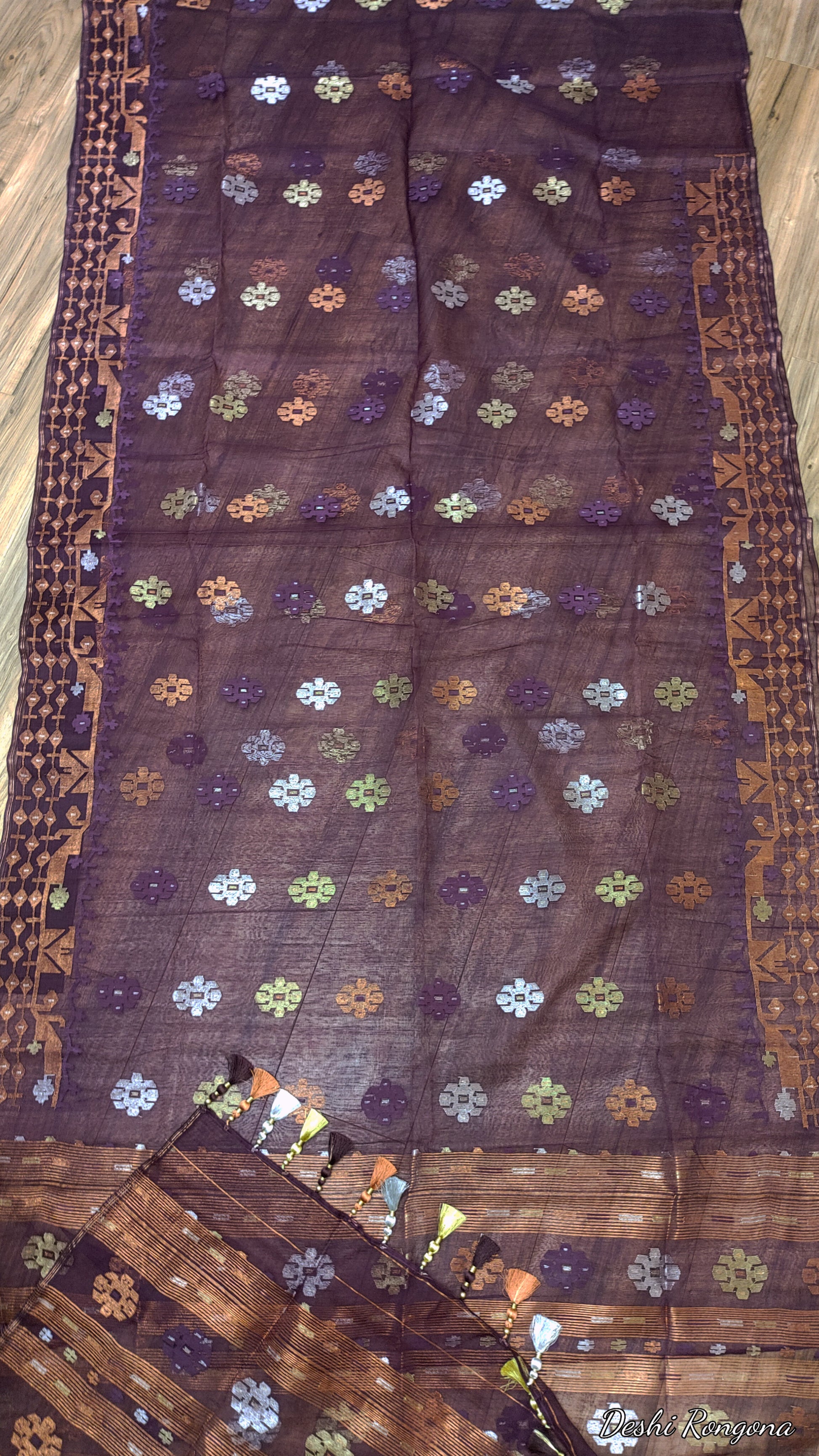 Discover the elegance of the traditional Dhakai Jamdani saree, featuring a gorgeous deep plum purple color with a delicate Matching cotton thread and Copper Zari thread work. This saree showcases the beauty and craftsmanship of Dhaka's weaving tradition, ideal for cultural occasions or stylish everyday wear.