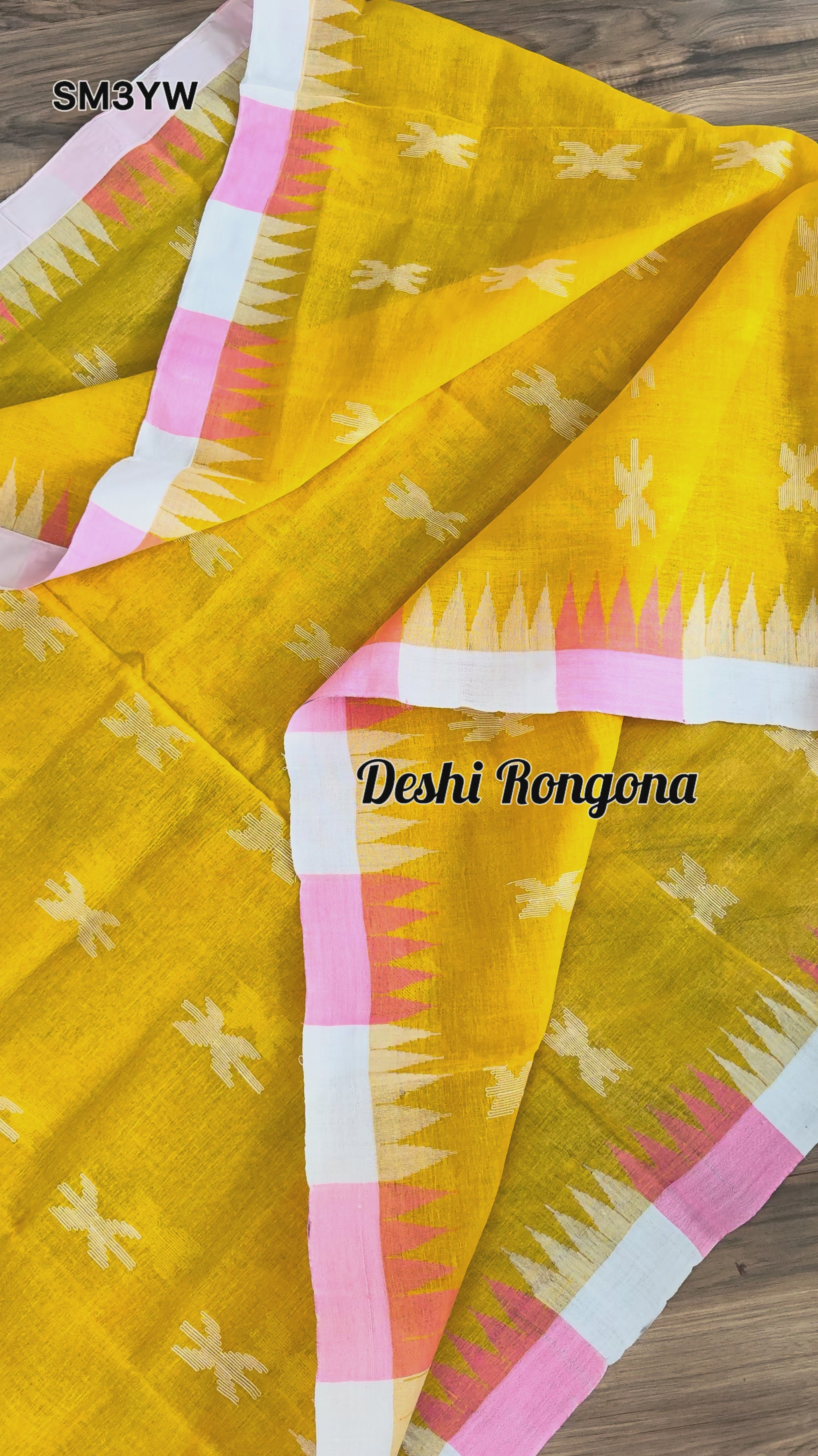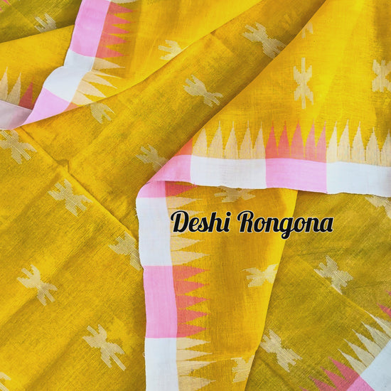 Sylheti Monipuri Handwoven Soft Cotton Saree – Mustard Yellow with White -pink Temple Border & Floral Work