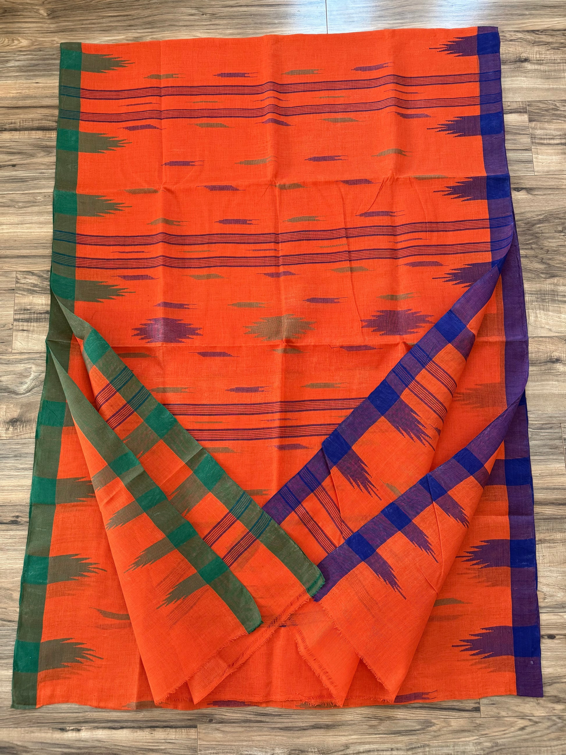 Step into the elegance of tradition with this Sylheti Monipuri Handwoven Cotton Saree in vibrant orange with a green- blue ganga jayna border. A perfect representation of Bangladeshi tribal heritage, this saree is lightweight, soft, and comfortable. Handcrafted by skilled artisans, it offers a flawless drape that enhances your style.