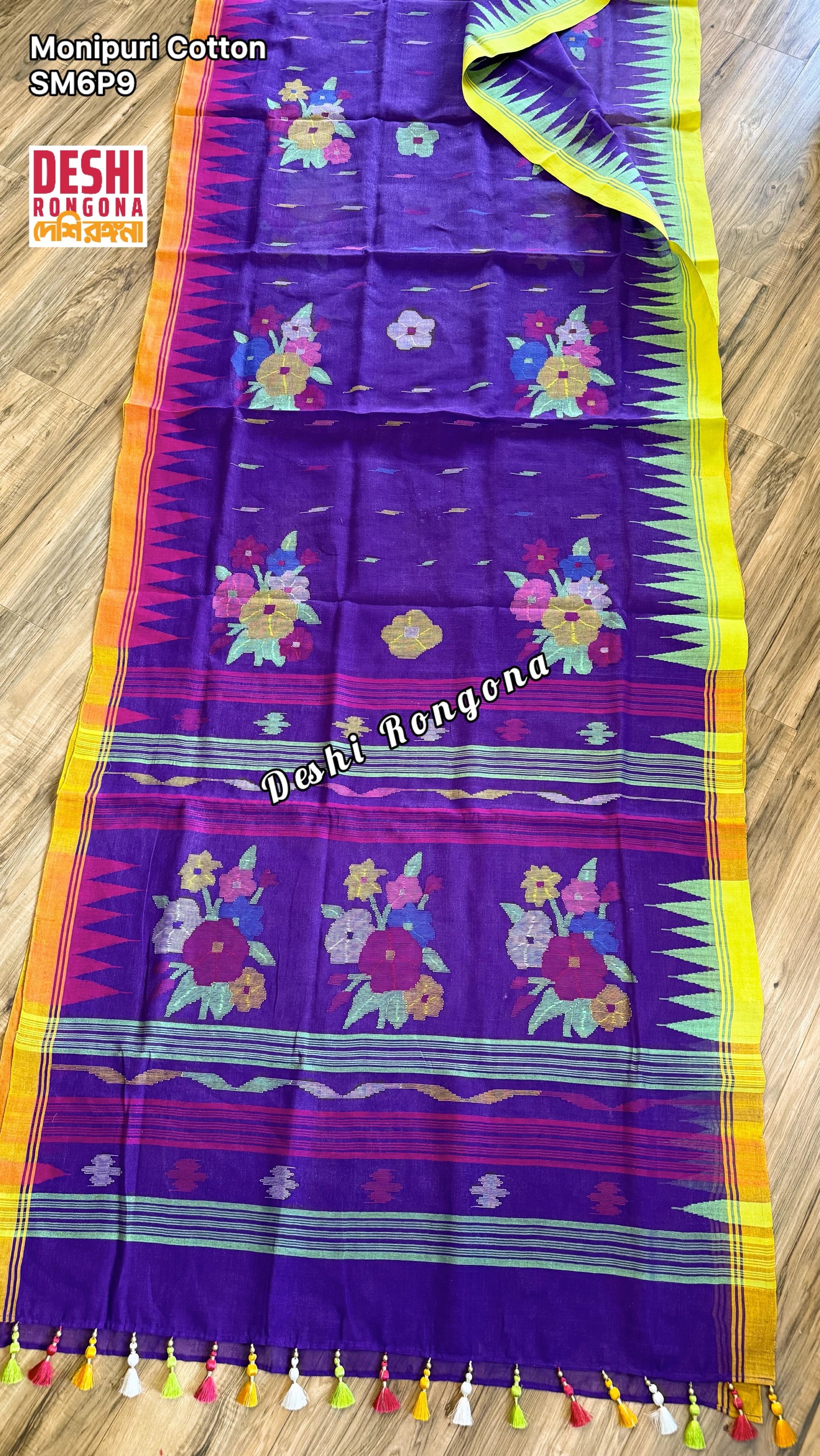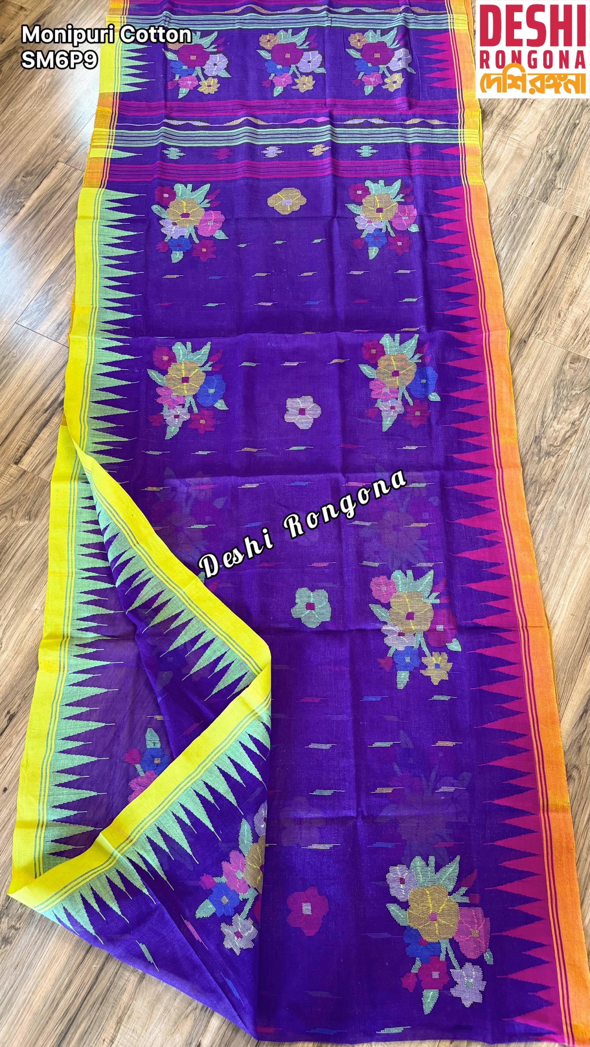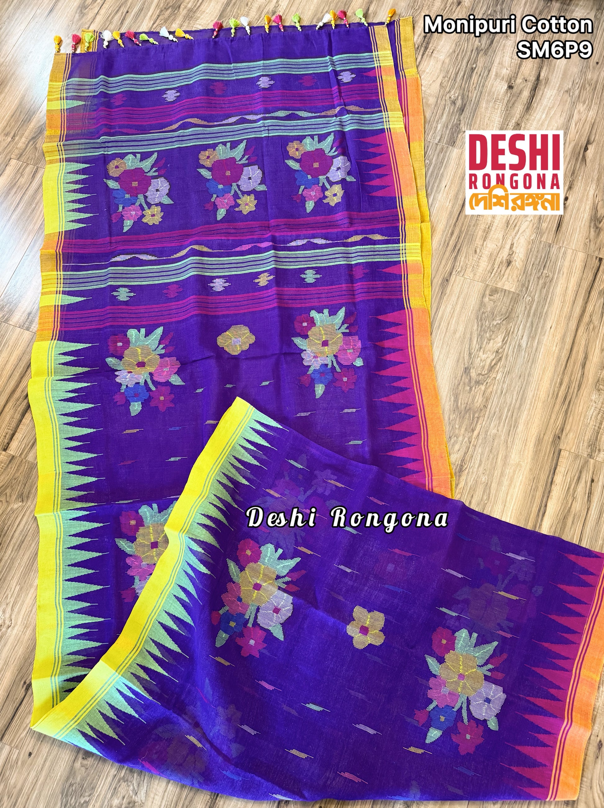 Discover the elegance of a Sylheti Monipuri Handwoven Soft Cotton Saree, featuring a stunning purple base Ganga Jamuna temple border and floral motifs. This Bangladeshi tribal saree is crafted from pure handloom cotton, ensuring a lightweight, breathable, and comfortable drape for any occasion.