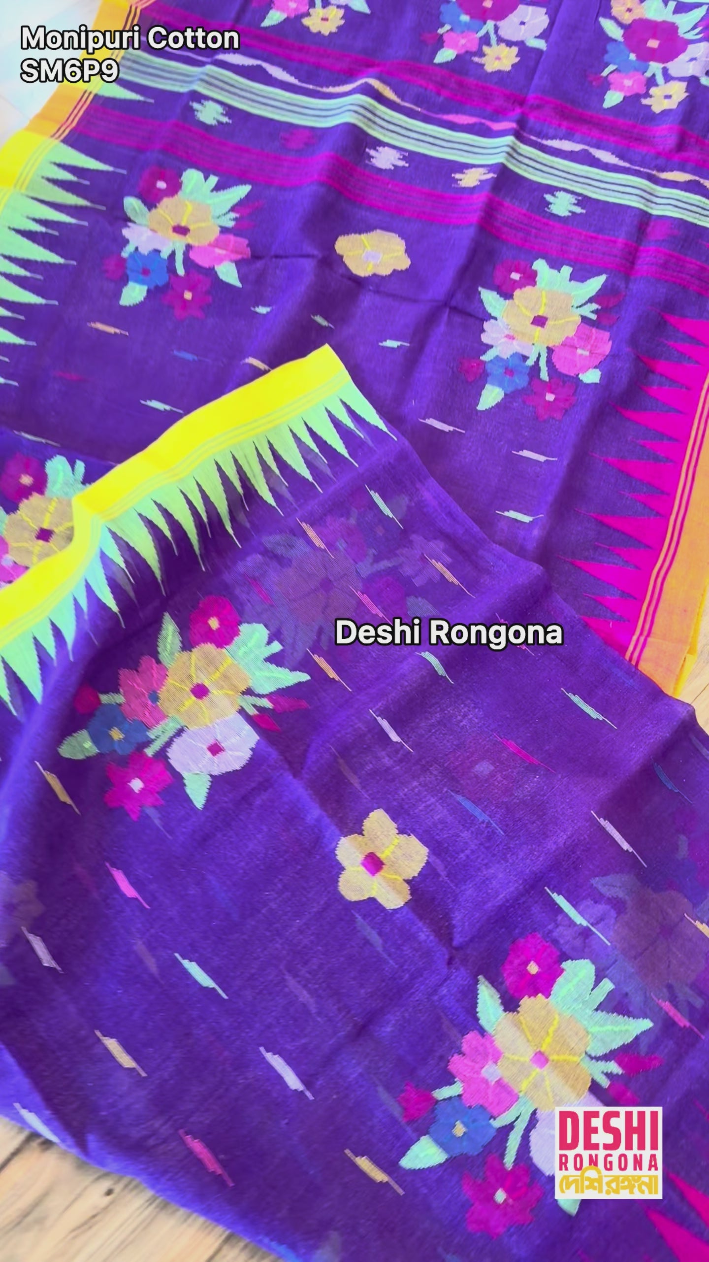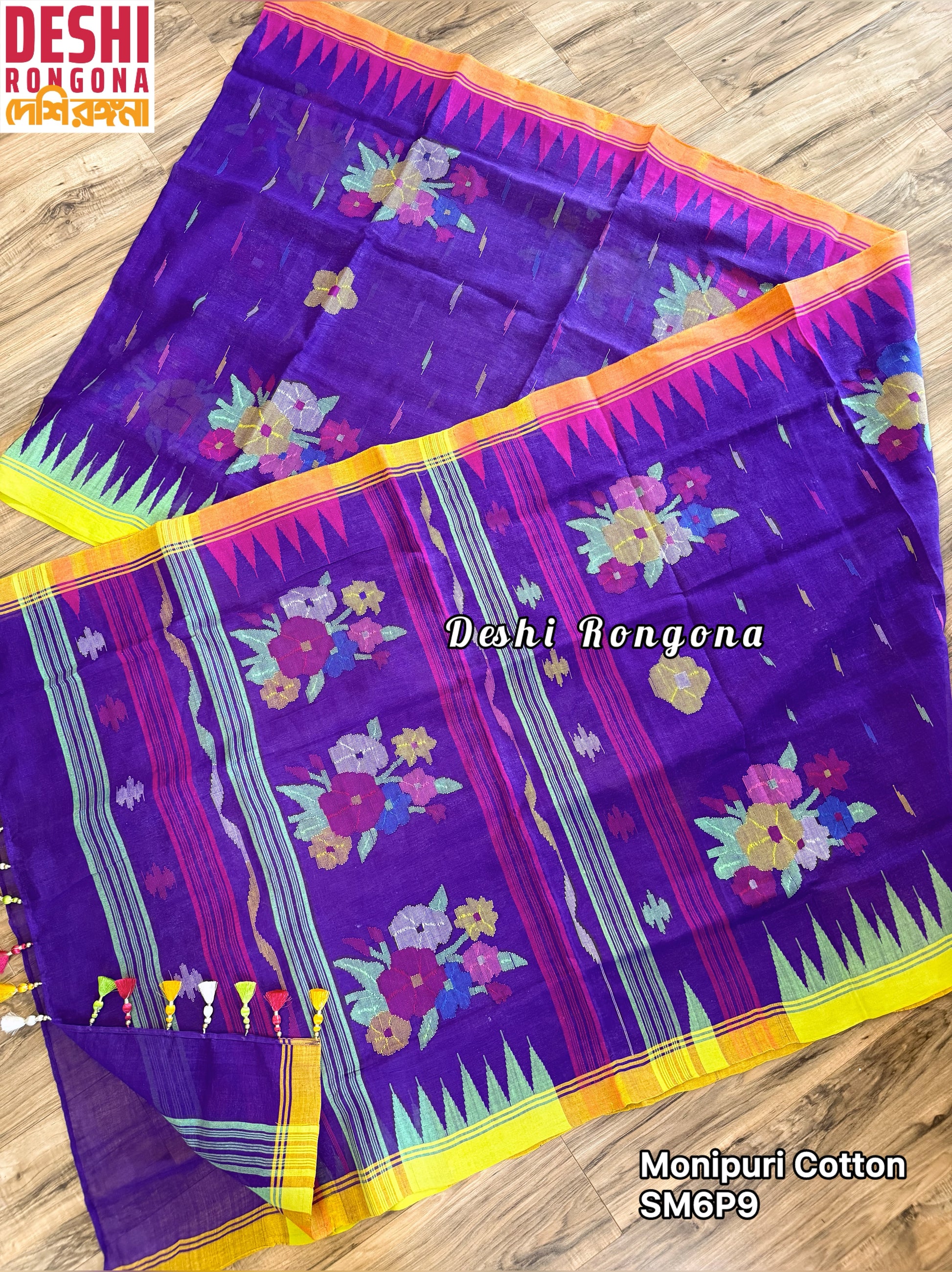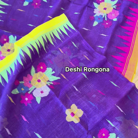 Discover the elegance of a Sylheti Monipuri Handwoven Soft Cotton Saree, featuring a stunning purple base Ganga Jamuna temple border and floral motifs. This Bangladeshi tribal saree is crafted from pure handloom cotton, ensuring a lightweight, breathable, and comfortable drape for any occasion.